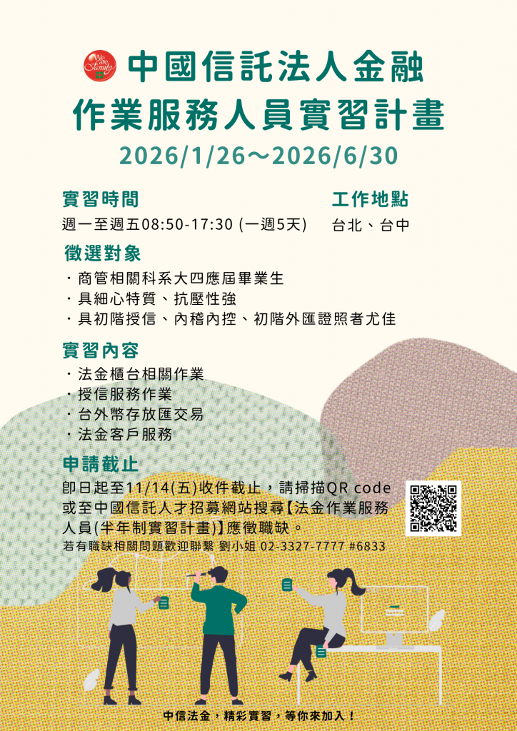 ■ 申請方式:11/14(五)前,至中國信託人才招募網站搜尋「法金作業服務人員(半年制實習計畫)」應徵。