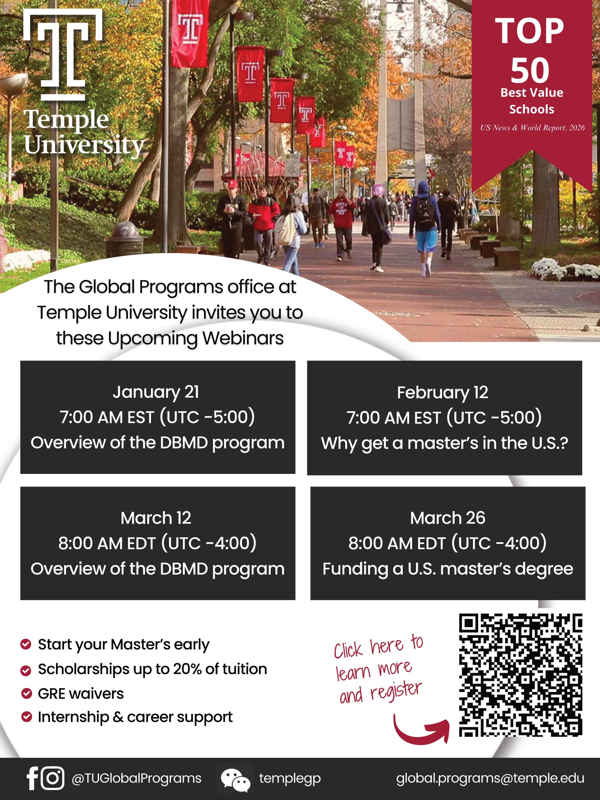 三、各場次皆採線上辦理,報名與會議連結請逕至天普大學官方網站查詢:https://globalprograms.temple.edu/study-abroad-information-session