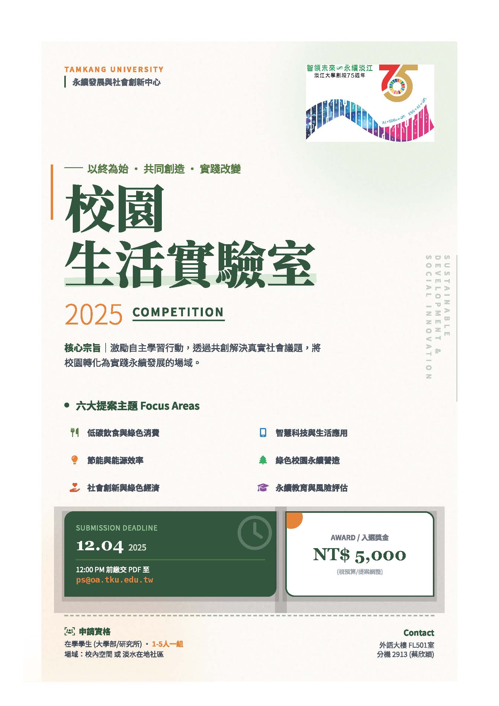 請將申請表以PDF檔方式附件夾檔,Email至ps@oa.tku.edu.tw,郵件主旨為「申請114學年度校園生活實驗室獎學金-聯絡窗口姓名-聯絡窗隊名」;3份紙本文件送至永續發展與社會創新中心辦公室(外語大樓FL501室)。淨零碳排推動組承辦人:蔡欣穎,分機2913。