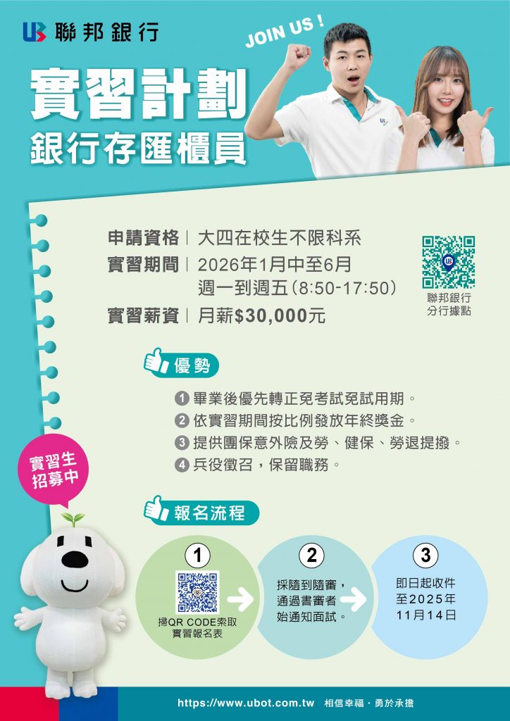 【聯邦銀行】產學合作實習,收件至11/14(五)止