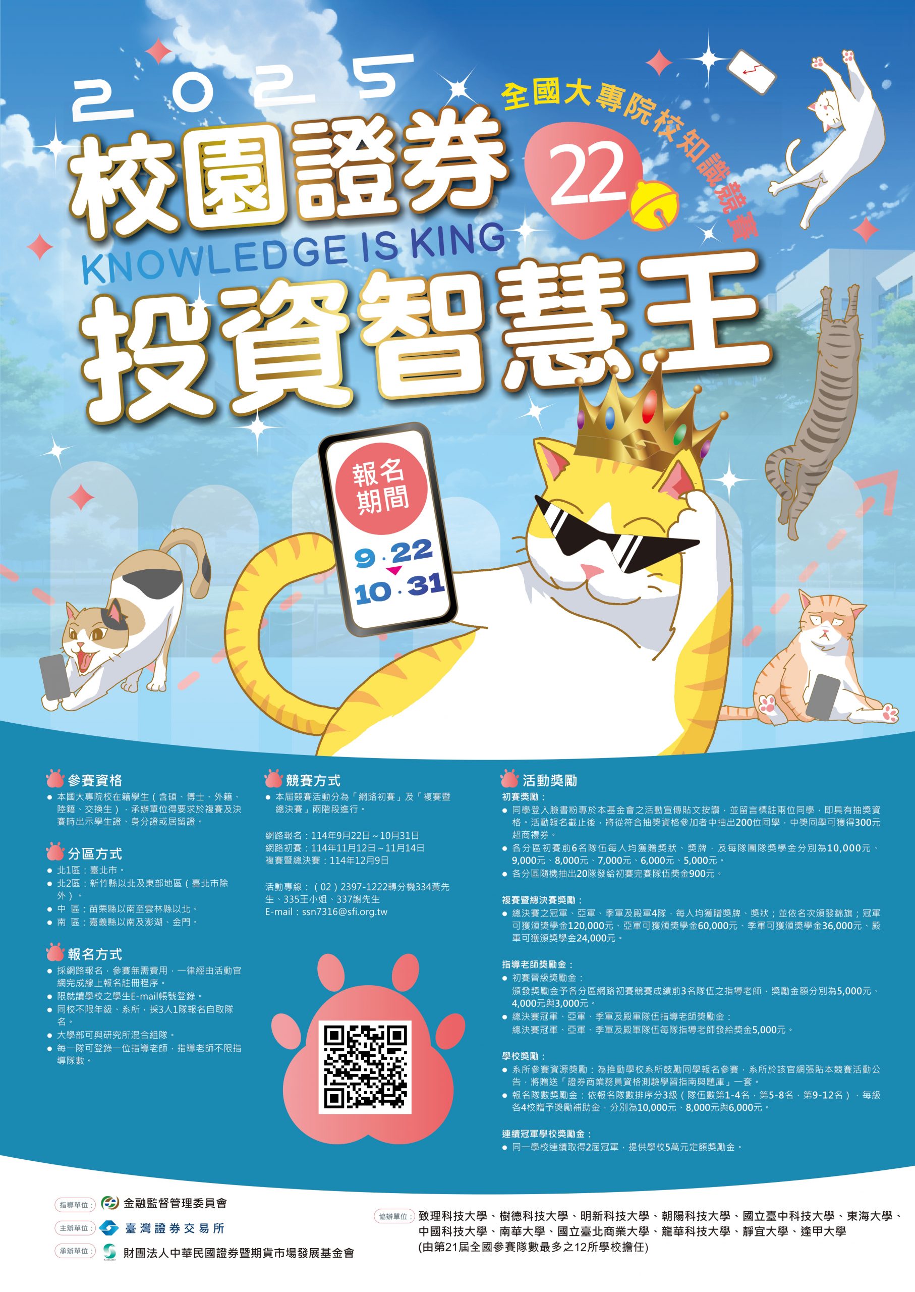 二、本競賽活動辦理至今已為第22屆,為全國大專院校學生年度重要賽事之一,證券期貨相關金融服務業界對本活動十分認同;依歷屆辦理經驗顯示,參賽獲獎的同學在就業上有加分效益。