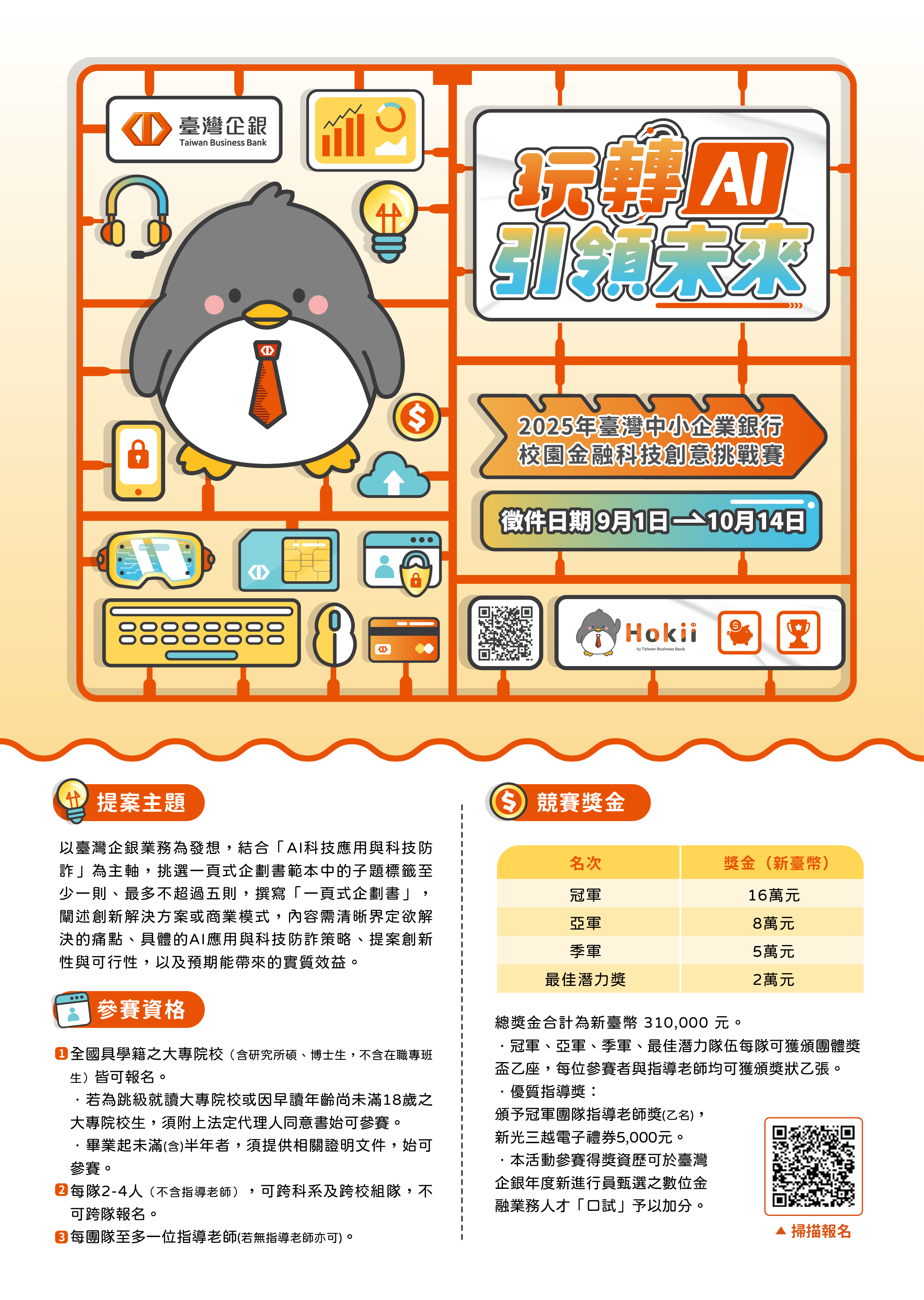 一、為響應金融教育向下扎根及數位金融普及趨勢,本院與臺灣中小企業銀行校共同規劃辦理「2025年臺灣中小企業銀行校園金融科技創意挑戰賽」,透過企劃書撰寫與多元創意展示,鼓勵學子揮灑想像、展現實力,發掘具潛力的FinTech新星,為未來金融服務注入無限可能。
